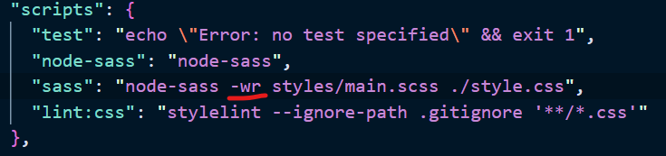 2. "scripts"의 "sass" 를 정의해놓은 영역에 -wr추가