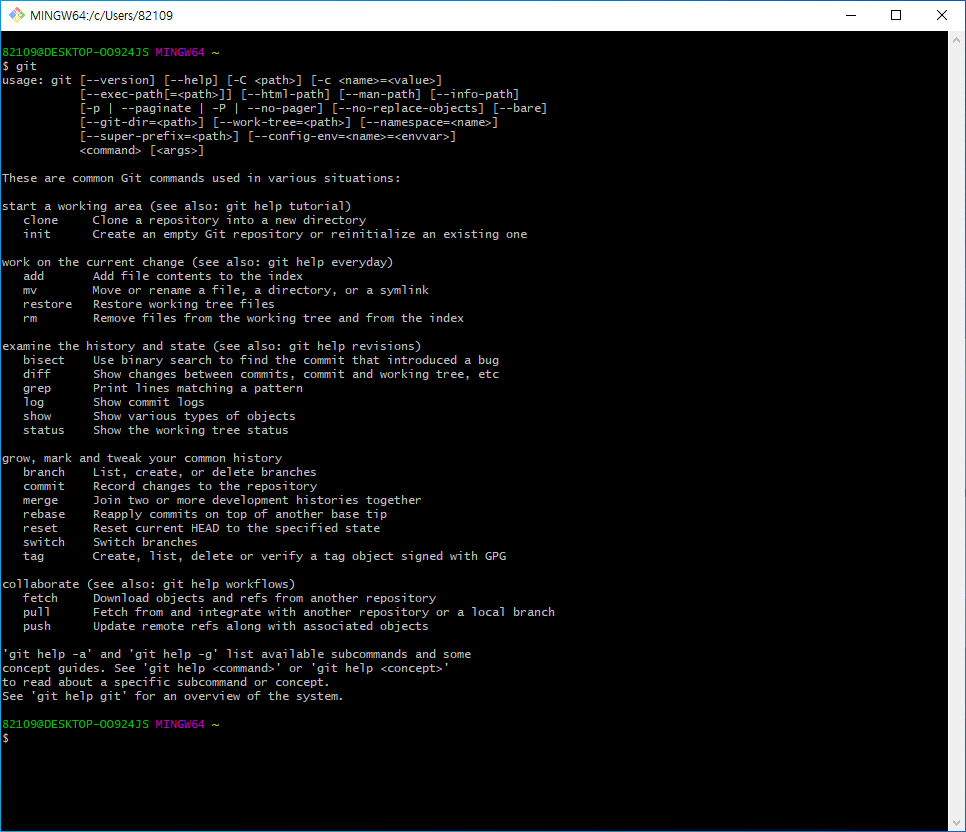 깃이 잘 설치되었는지 확인하고 싶다면 저기에 git 이라고 치고 엔터를 친다.