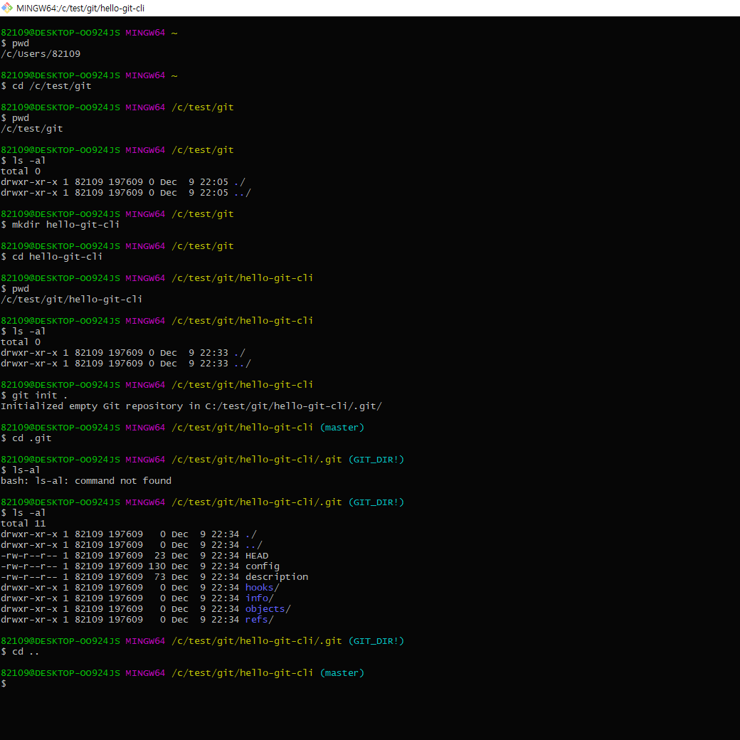 - 이렇게 선언하면 안에 .git이라는 파일이 생성되었다는 메세지가 뜬다. ( 그 안내가 이것임 --> Initialized empty Git repository in C:/test/git/hello-git-cli/.git/ )