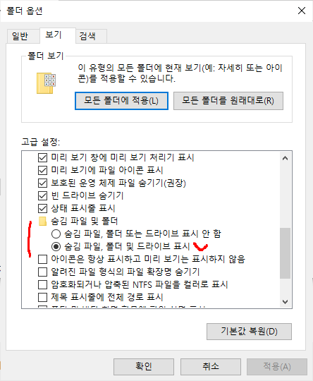 윈도우 검색에 파일탐색기를 검색한 후 - 옵션 - 보기탭 - 숨김 파일, 폴더 및 드라이브 표시 체크 하면 볼 수 있다.