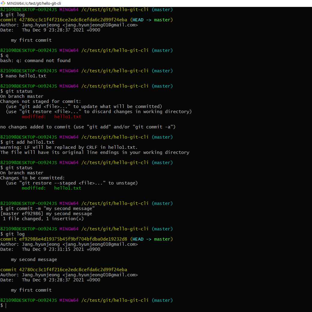 5) git commit -m "my first commit"