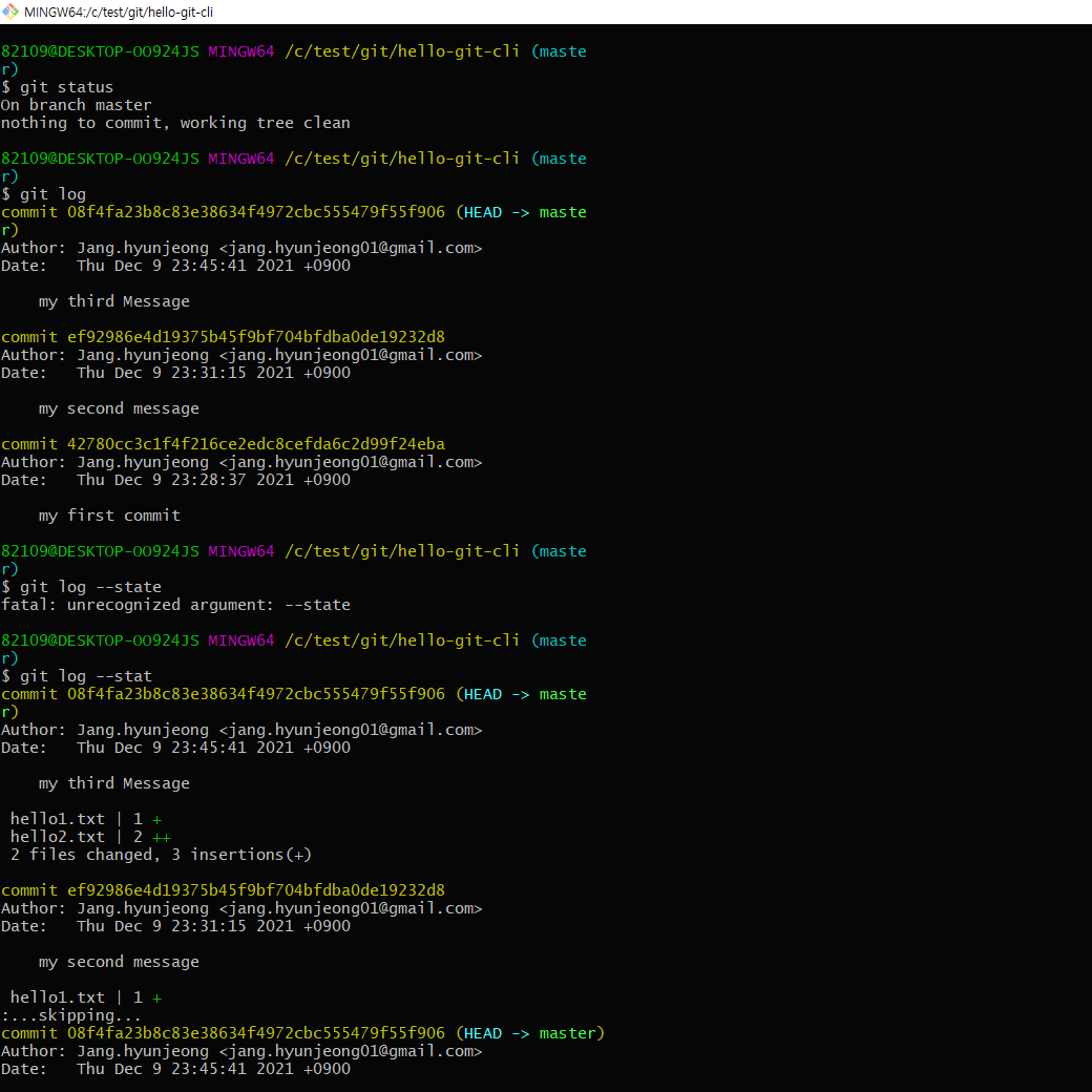 - nothing to commit, working tree clean : 버전이 되지 않은 수정사항이 없다. 버전으로 만들 것이 없다.