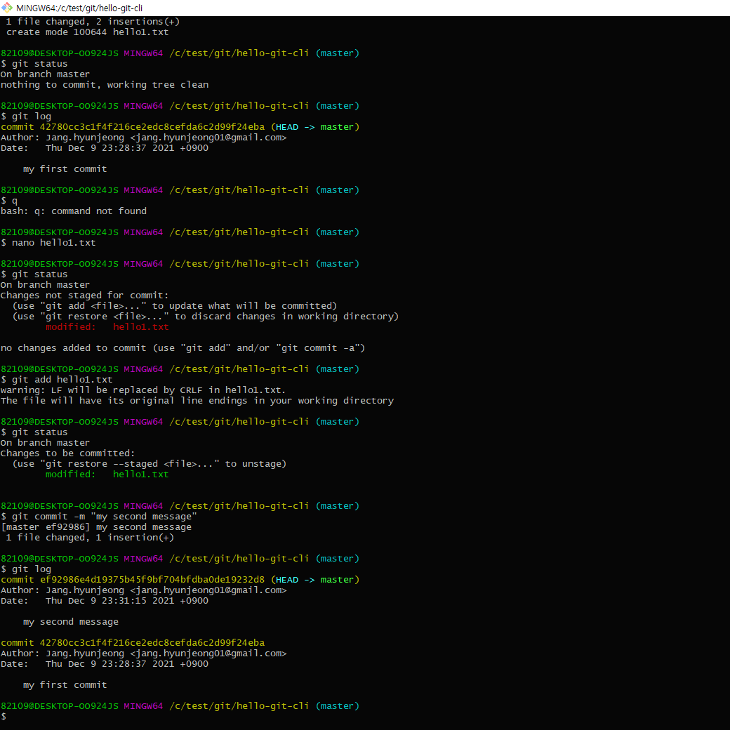 # 커밋하기까지의 과정들 .. ( 파일만들기 / 파일 수정하기 / git 상태보기 / stage에 파일올리기 / 커밋하기 / 수정된 내역 확인하기 )