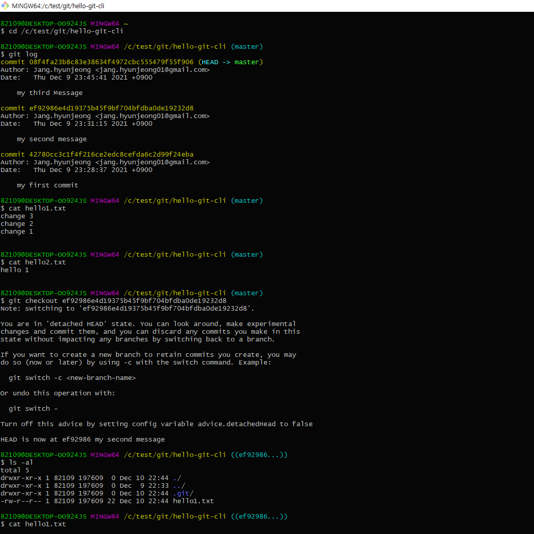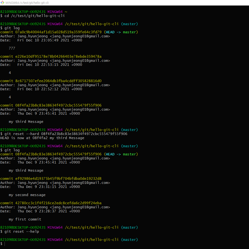 - --hard :: 이 버전으로 돌아감 + 지금 작업중이던 것도 모두 리셋