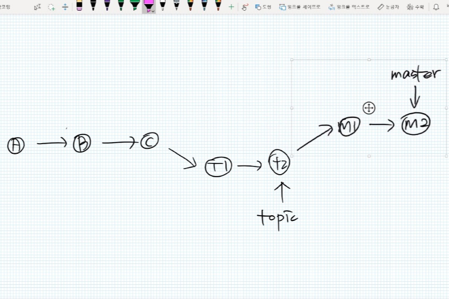 - 상황 : topic branch t2 에서 작업한 내용이 master m2에도 반영이 되었으면 좋겠다.