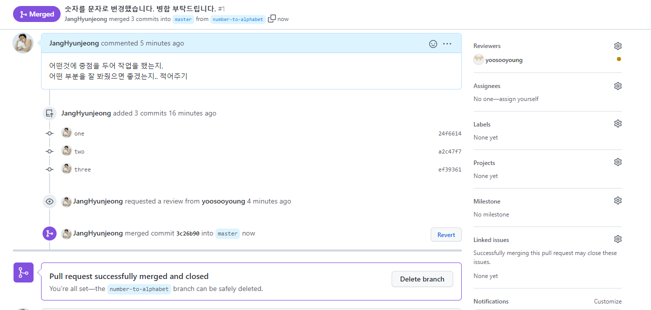 - 내가 한 작업을 끝냈을때, 다른사람들의 코드리뷰(조언)을 받고싶을 때 사용하는 기능