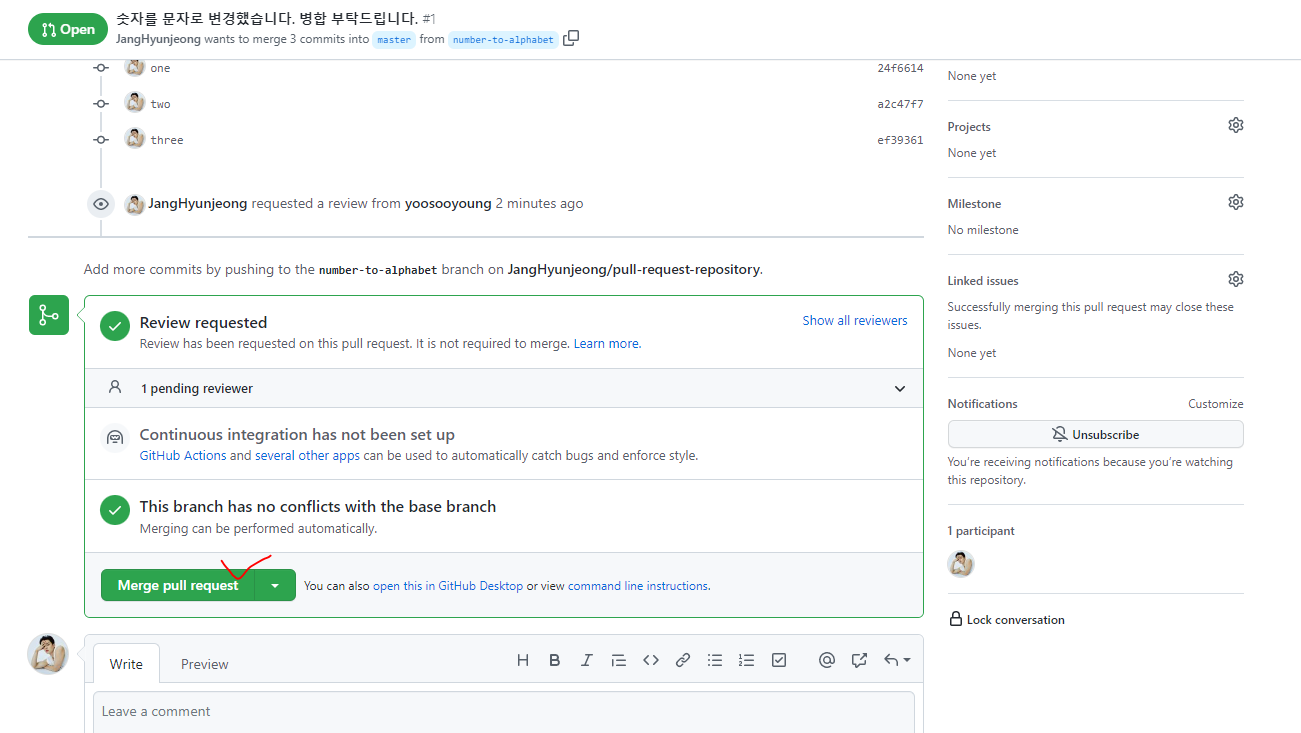 3. 작성 후 초록색 버튼 클릭 시 pull-request가 올라간다.