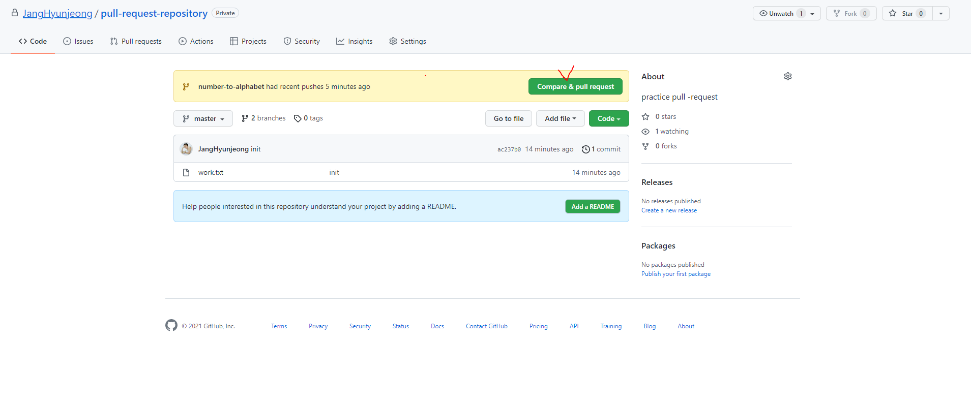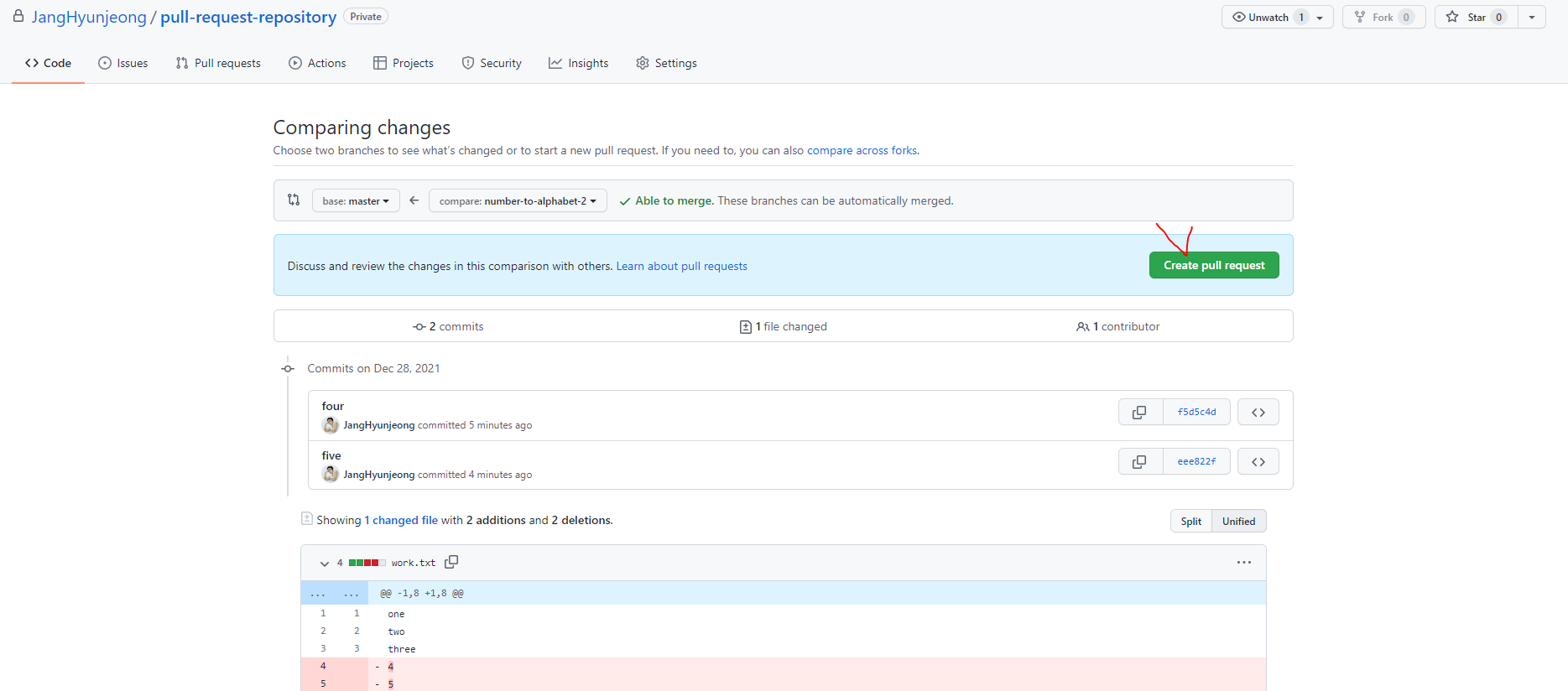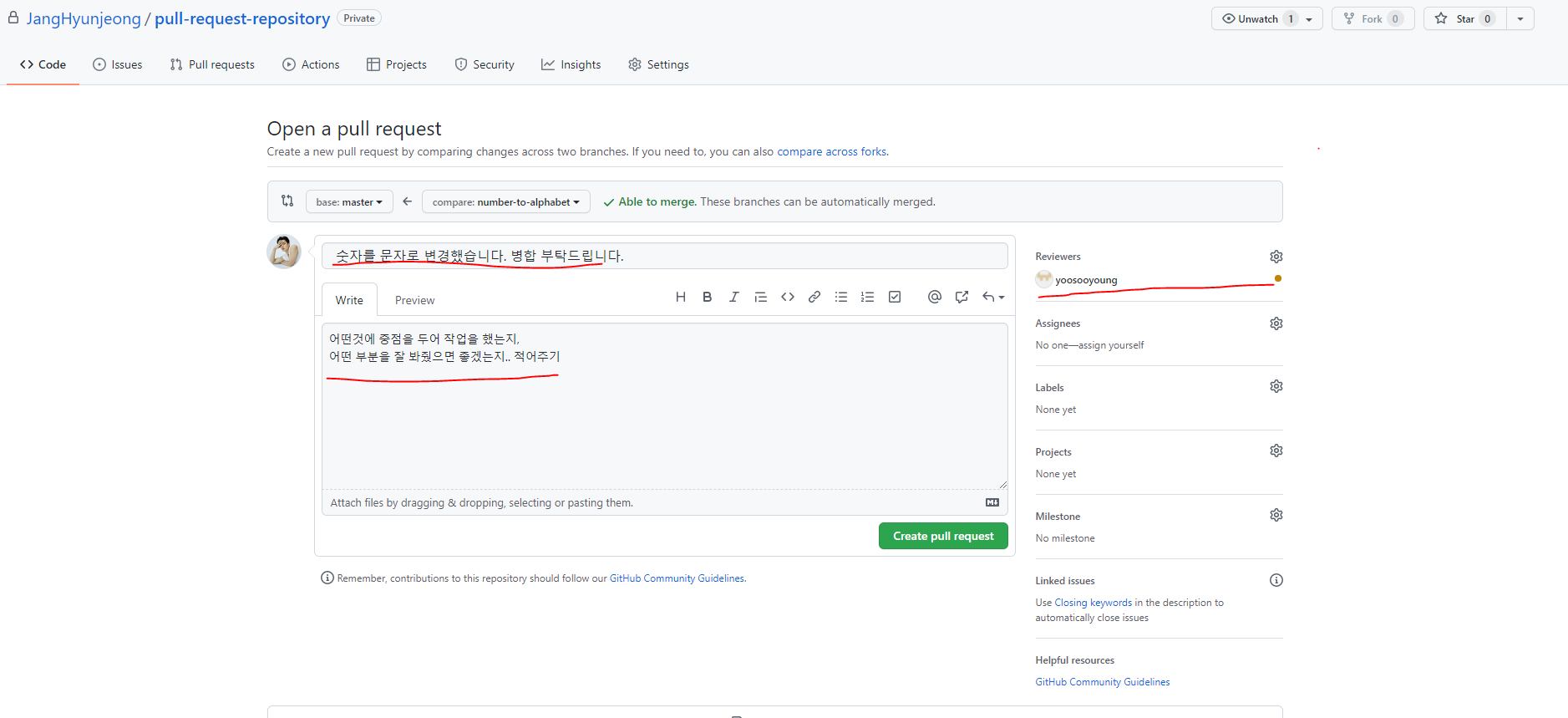 3. [ create pull request ] 버튼 클릭