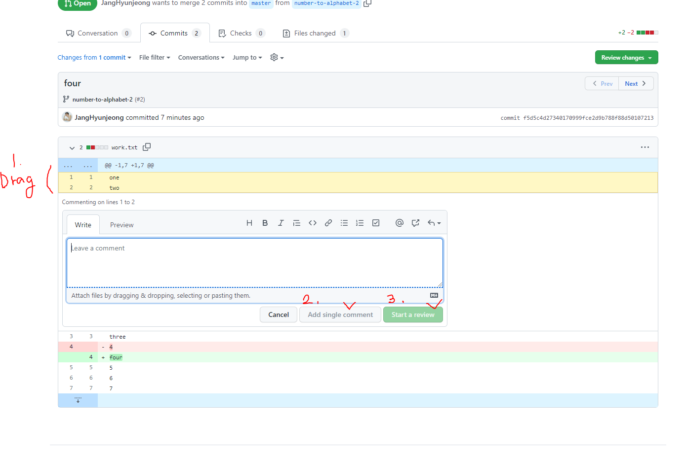 1. 원하는 수정 라인을 drag 후, + 버튼을 클릭하면, 아래와같이 댓글창이 나온다.