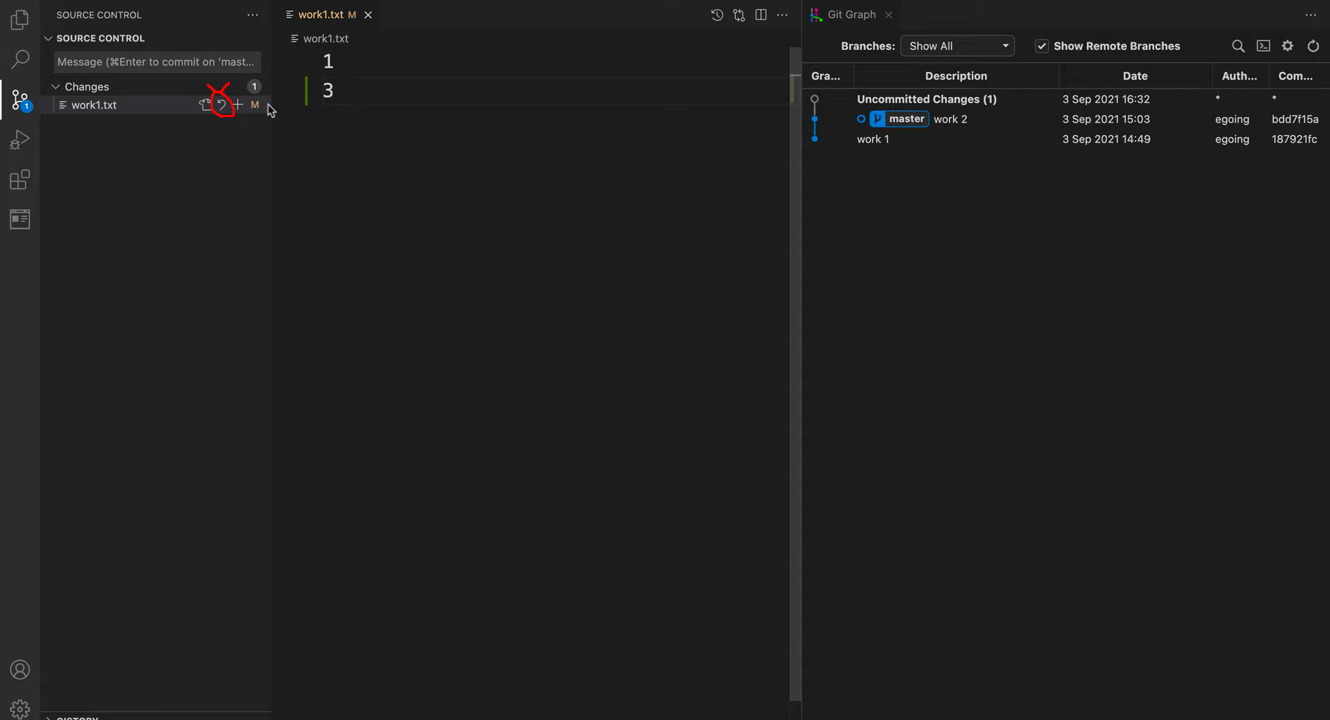 1. 왼쪽 git 탭클릭 - changes 에 안에 수정할 파일 마우스 오버 - discard changes (화살표 아이콘) 클릭!